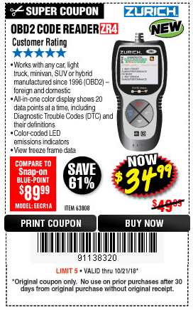 ZURICH OBD2 CODE READER ZR4 Lot No. 63808 Expired: 10/21/18 - $34.99 Coupon Code: '91138320'