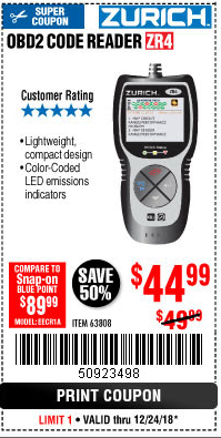 ZURICH OBD2 CODE READER ZR4 Lot No. 63808 Expired: 12/24/18 - $44.99 Coupon Code: '50923498'