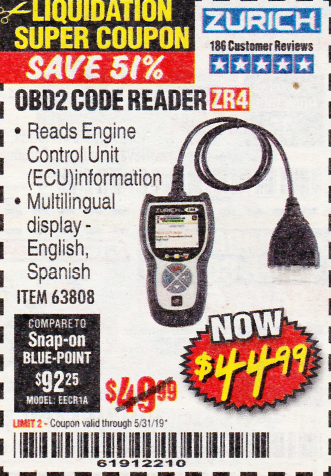 ZURICH OBD2 CODE READER ZR4 Lot No. 63808 Expired: 4/21/19 - $44.99 Coupon Code: '69188301'