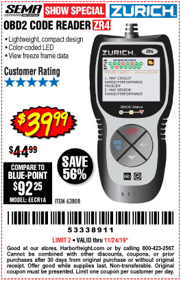 ZURICH OBD2 CODE READER ZR4 Lot No. 63808 Expired: 11/24/19 - $39.99 Coupon Code: '49730679'