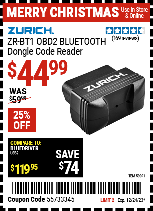 ZURICH ZR-BT1 OBD2 BLUETOOTH DONGLE CODE READER Lot No. 59091 Expired: 12/24/23 - $44.99 Coupon Code: '55733345'
