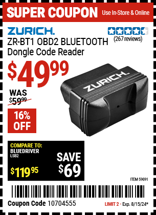 ZURICH ZR-BT1 OBD2 BLUETOOTH DONGLE CODE READER Lot No. 59091 Expired: 8/15/24 - $49.99 Coupon Code: '10704555'