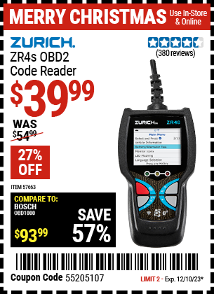 ZURICH ZR4S OBD2 CODE READER Lot No. 57663 Expired: 12/10/23 - $39.99 Coupon Code: '55205107'