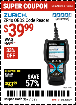 ZURICH ZR4S OBD2 CODE READER Lot No. 57663 Expired: 6/6/24 - $39.99 Coupon Code: '36751025'