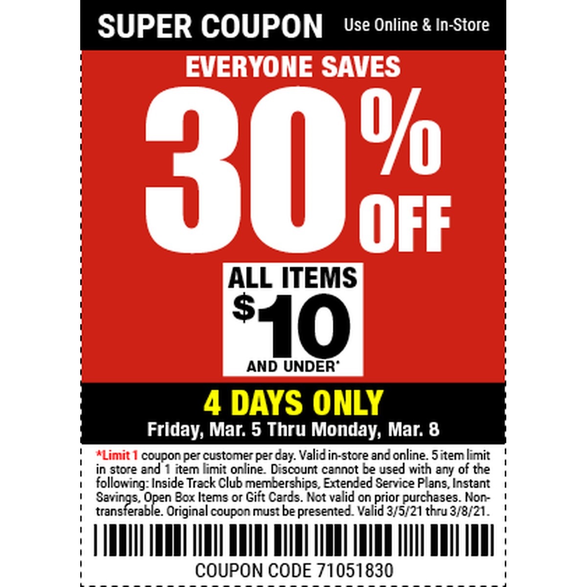 30% Off - Valid 03/05/2021 thru 03/08/2021 '71051830'